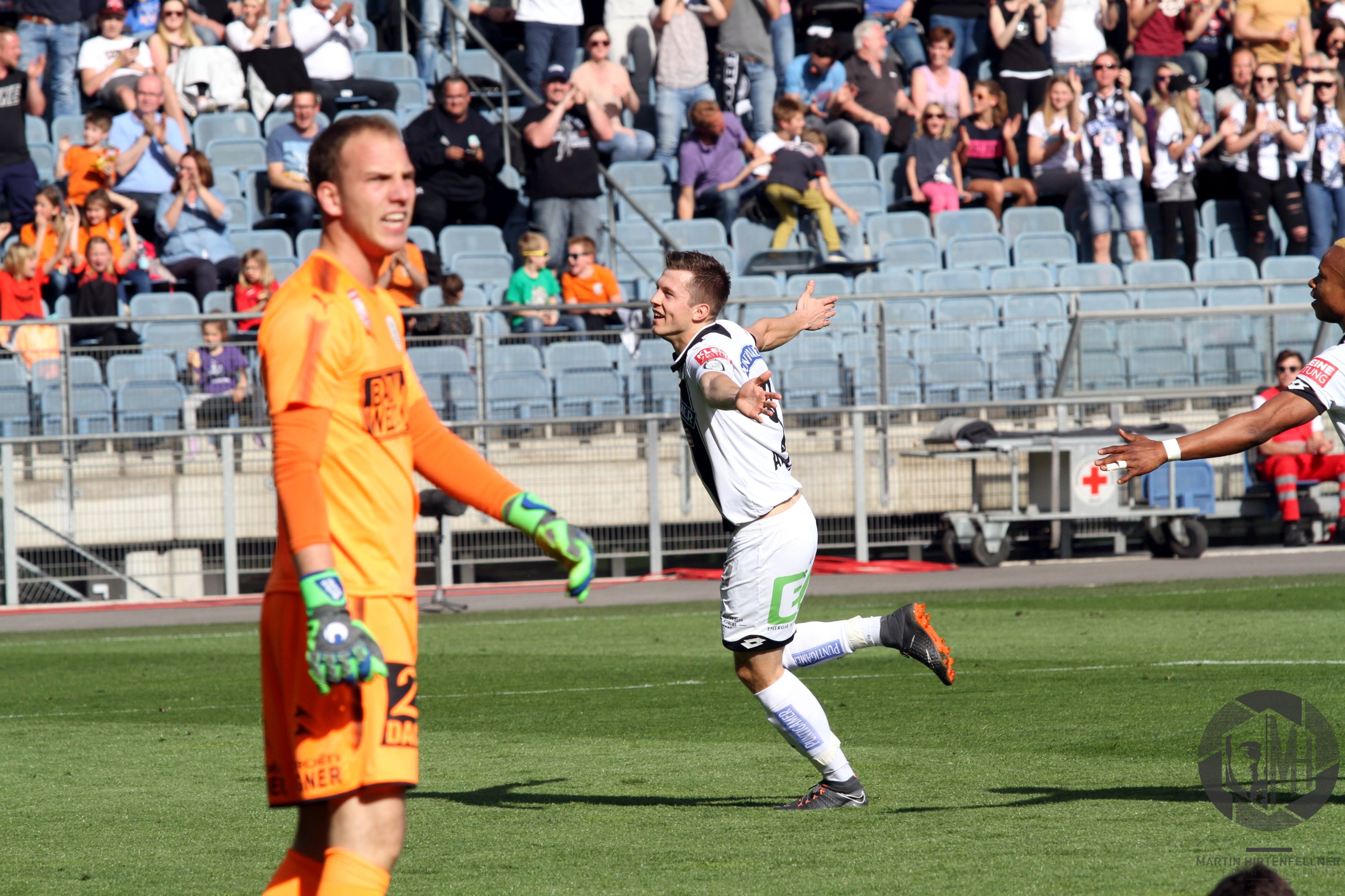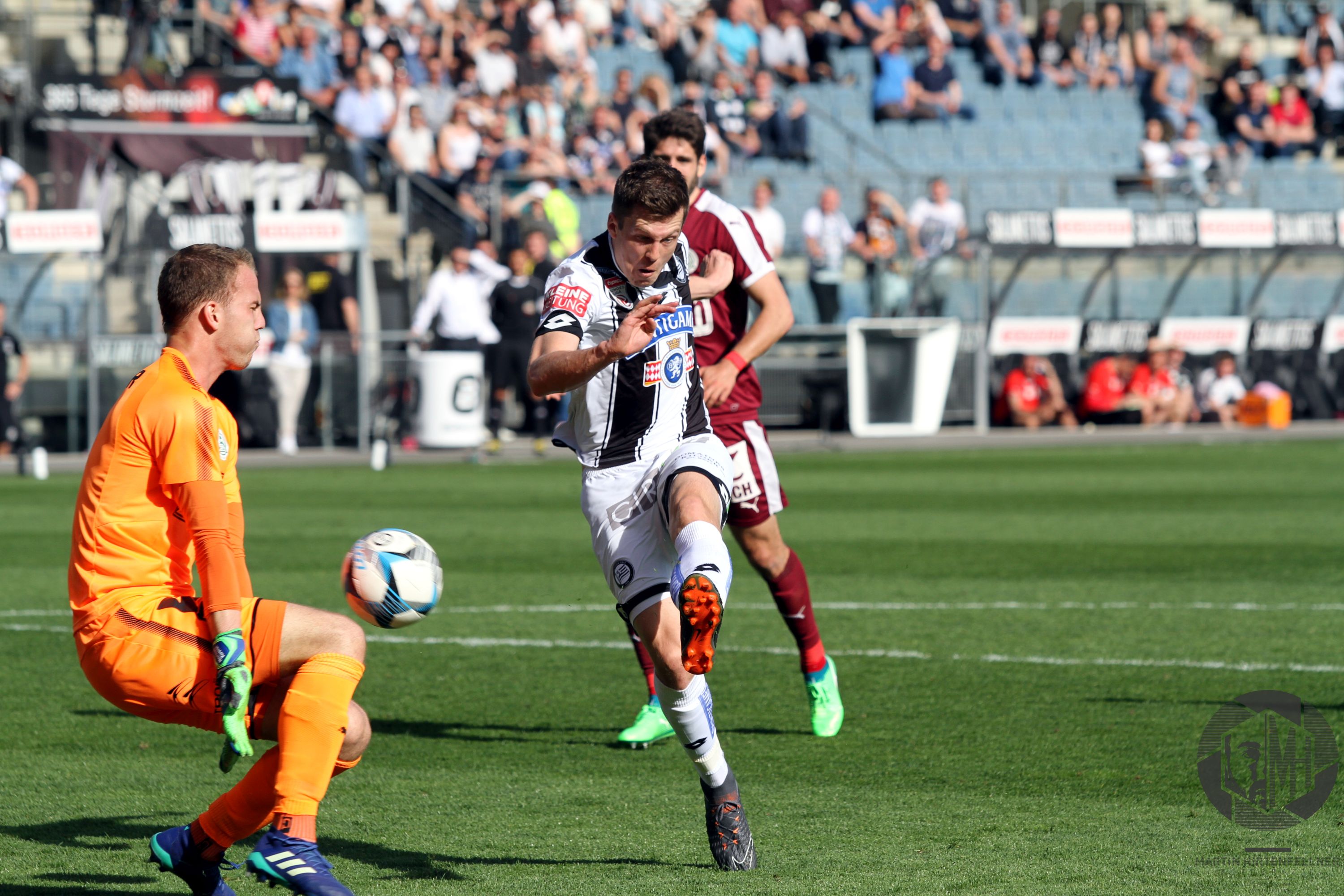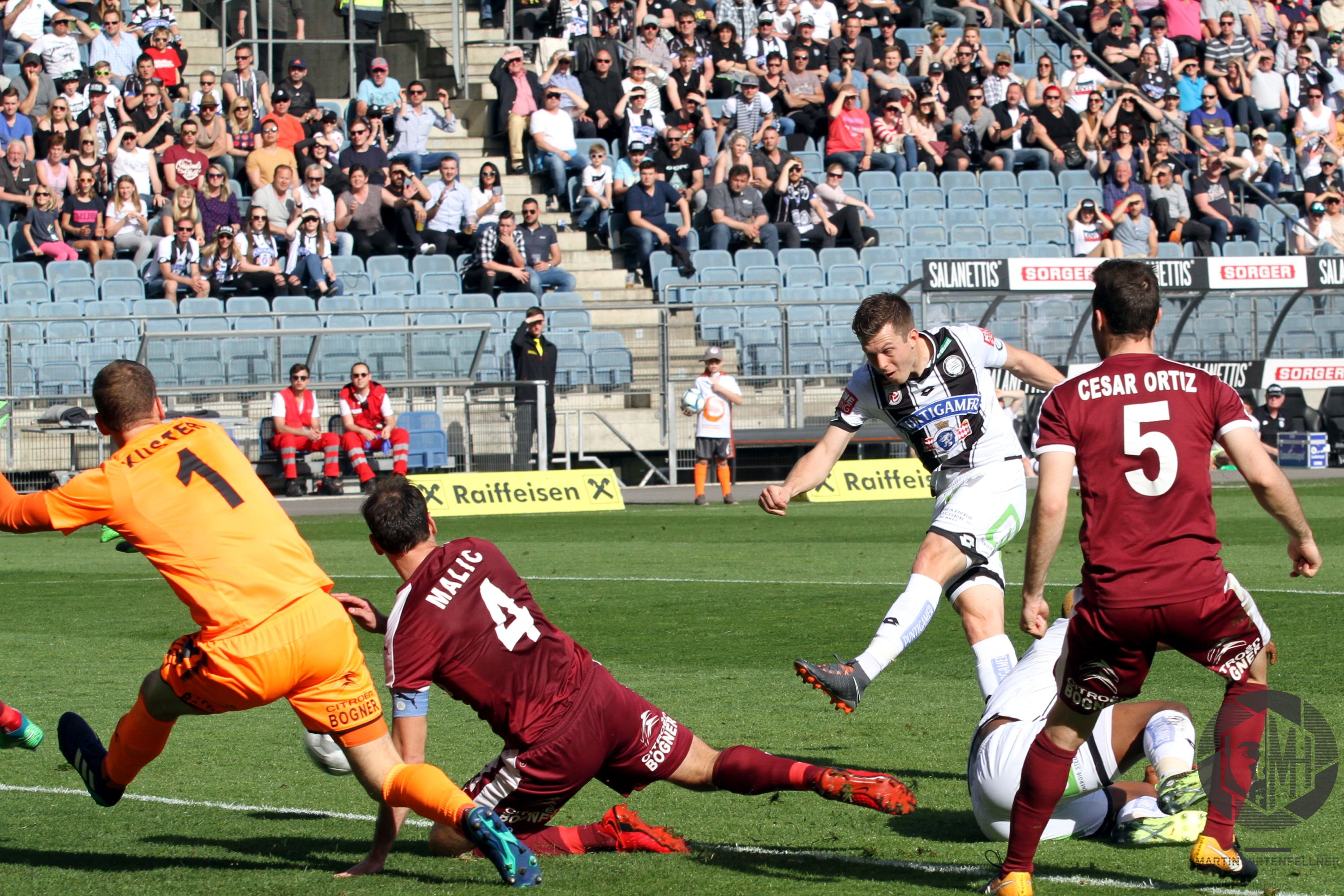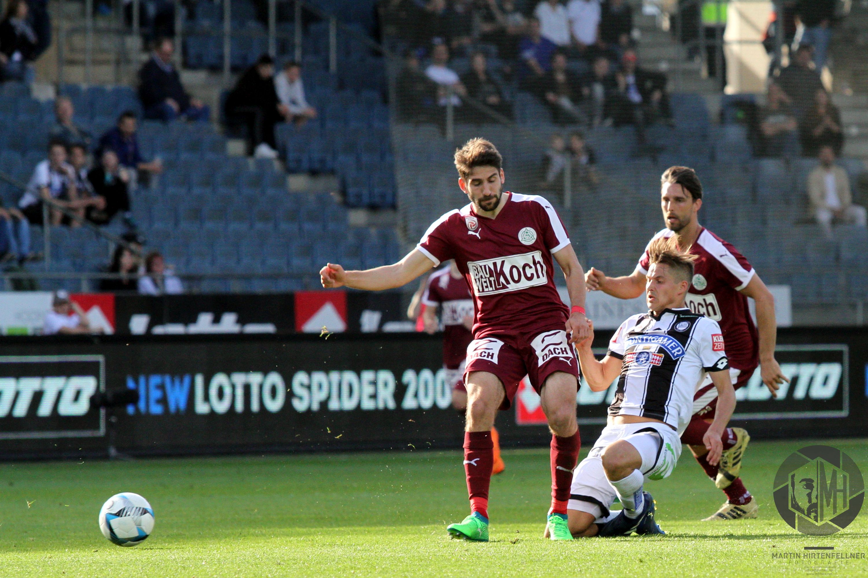 Pünktlich um 16:00 pfiff Schiedsrichter Julian Weinberger die Partie an und zunächst taten sich beide Teams schwer, ins Spiel zu finden. Sturm hatte oft den Ball, vermochte aber nichts Zwingendes zu kreieren. In der achten Spielminute herrschte dann erstmals Gefahr im Strafraum der Burgenländer. Alar flankte präzise in die Mitte, Kapitän Nedeljko Malic konnte gerade noch vor dem einschussbereiten Jakob Jantscher klären. Danach war der Tabellenzweite viel besser im Spiel und fand in der 13. Minute erneut die Möglichkeit zur Führung vor. Nach klasse Aktion von Eze zog Alar den Tick zu früh ab, Torhüter Markus Kuster konnte zur Ecke klären. Auf der Gegenseite klärte Spendlhofer vor Andreas Gruber. In der 16. Minute sorgte Dario Maresic dann beinahe für das Tor des Jahres, das man wahrscheinlich auch 20 Jahre später noch immer in jedem Highlightvideo über die Schwarz-Weißen finden würde. Nach Ecke von Peter Zulj setzte er in Cristiano Ronaldo-Manier zum Seitfallzieher an, der Versuch strich jedoch leider am rechten Pfosten vorbei. Auch danach blieb der Gastgeber am Drücker, einzig ein Torerfolg fehlte noch.