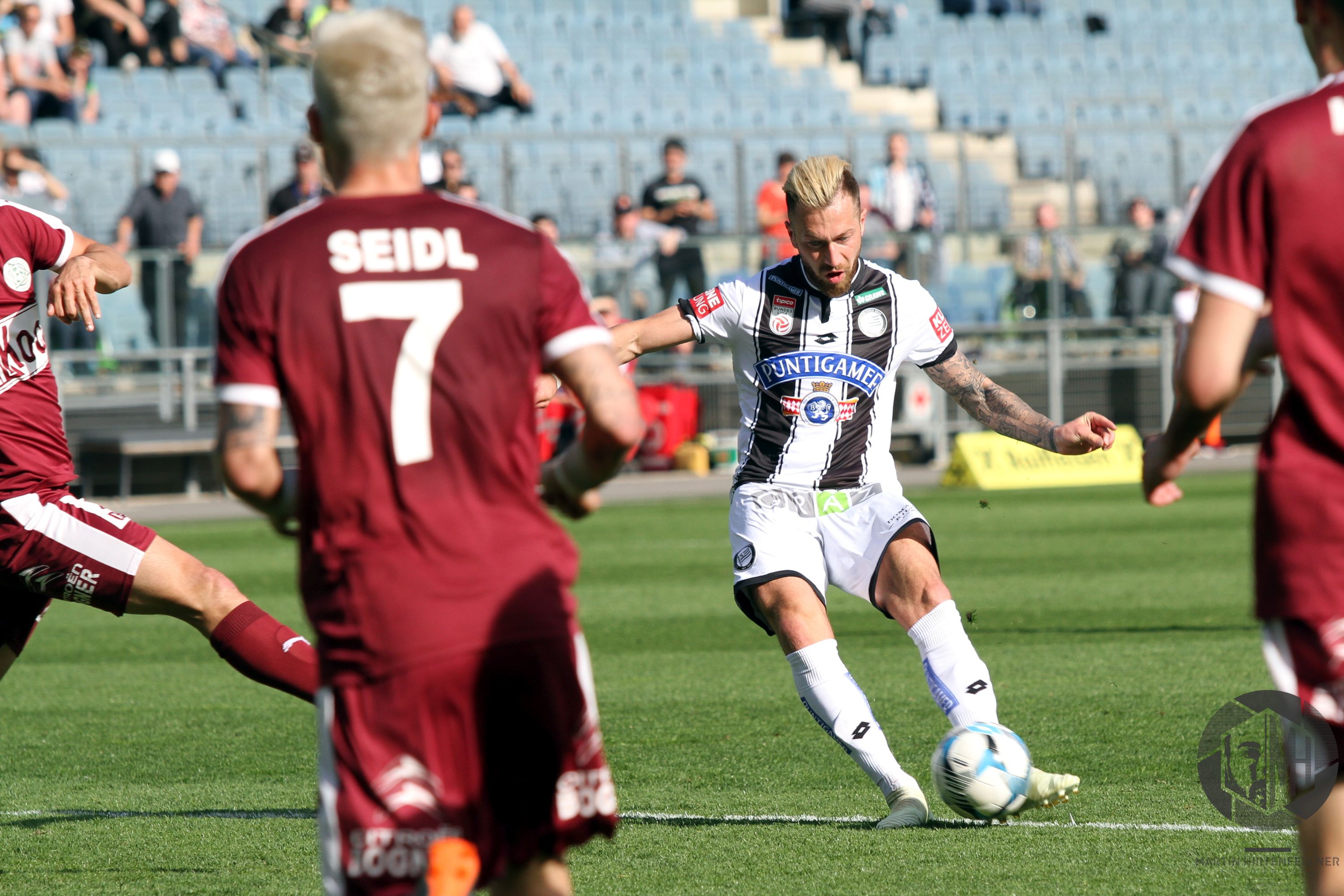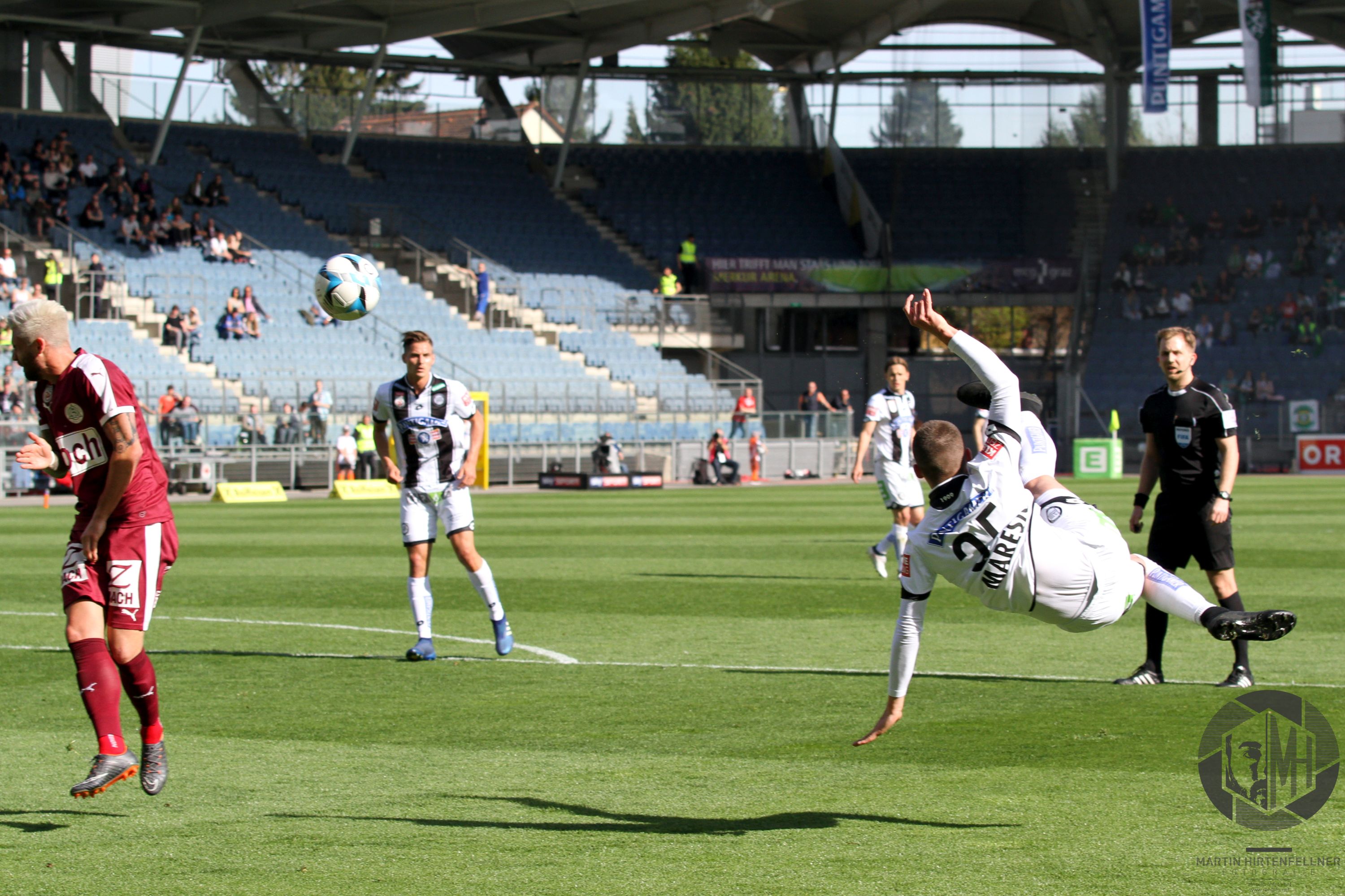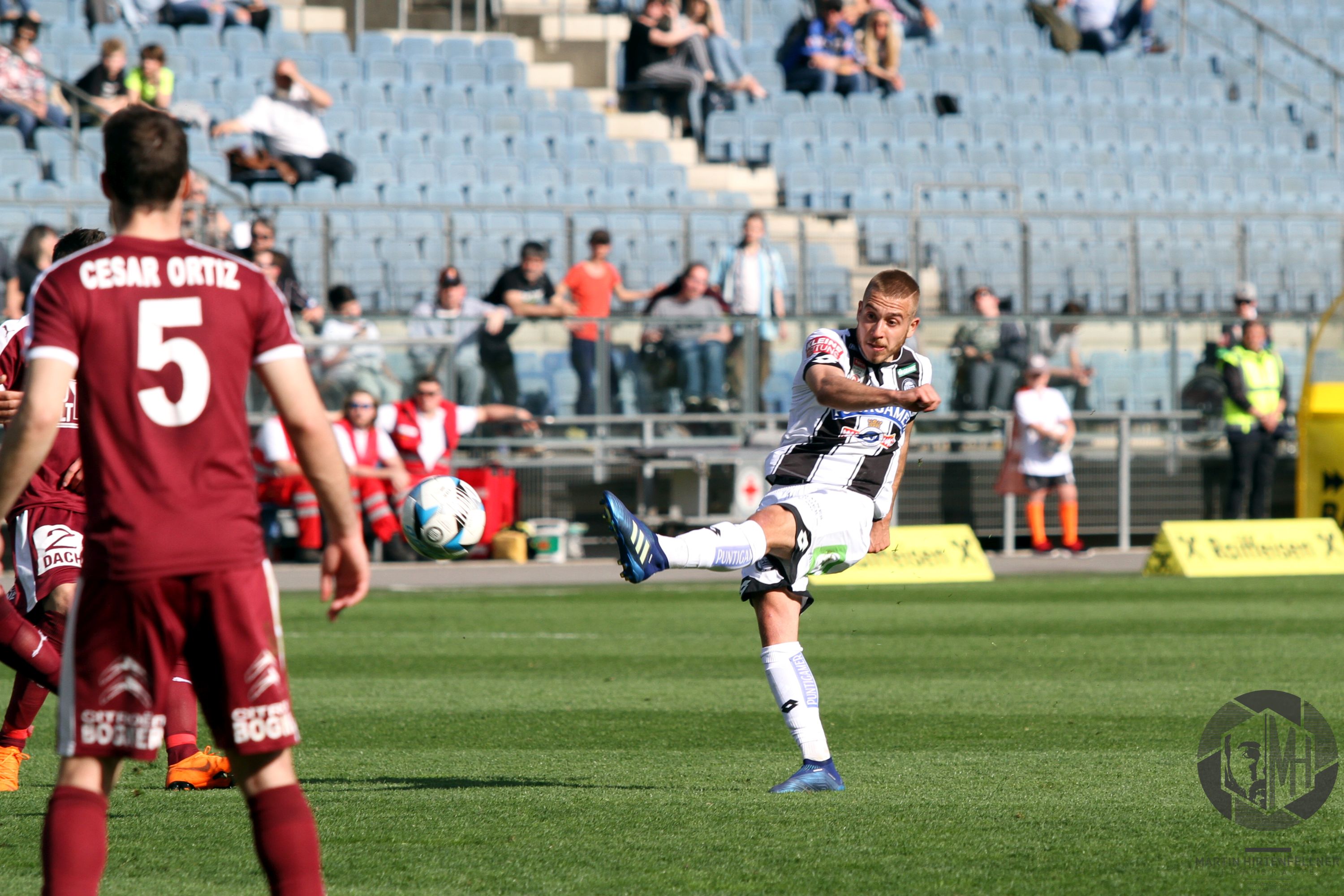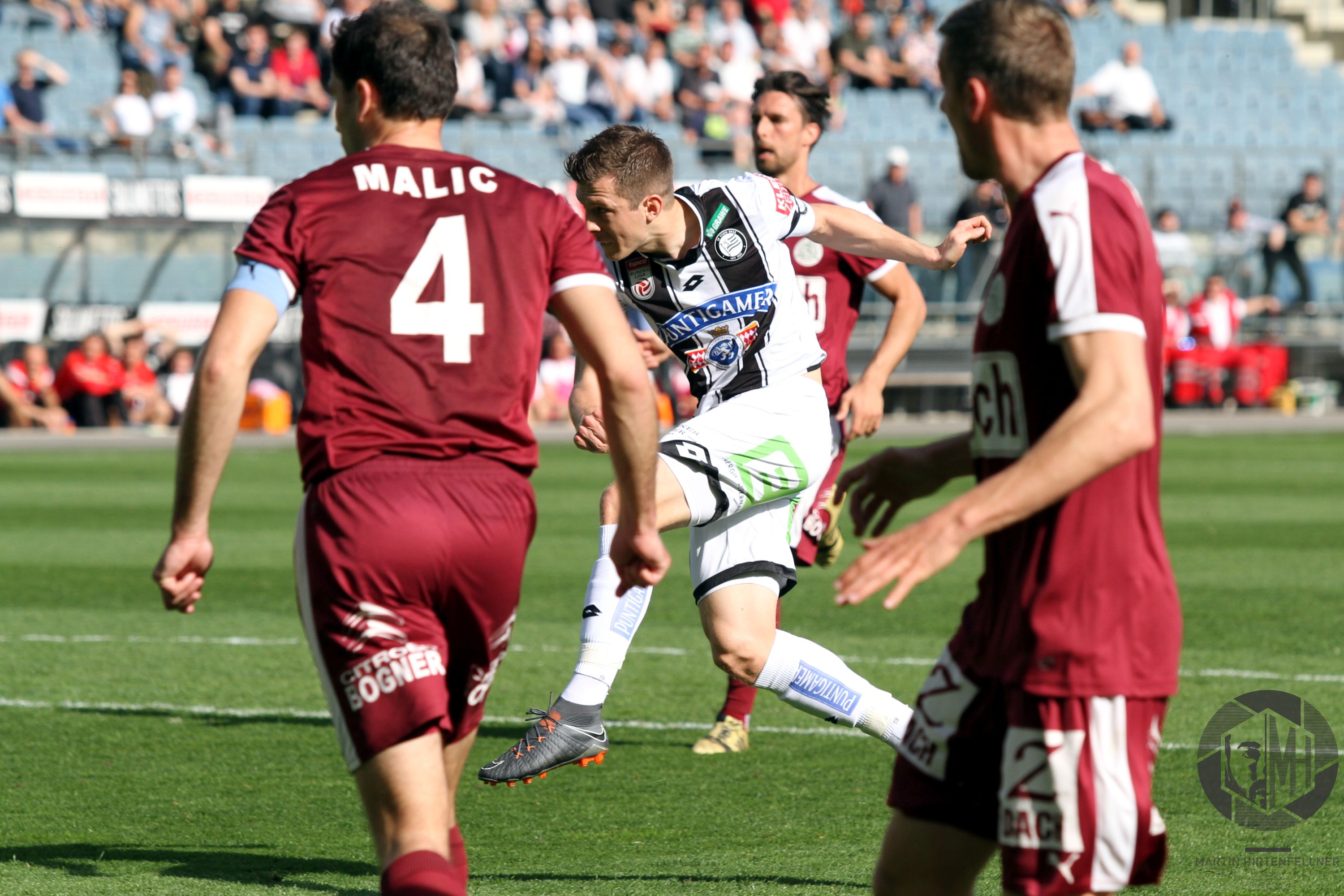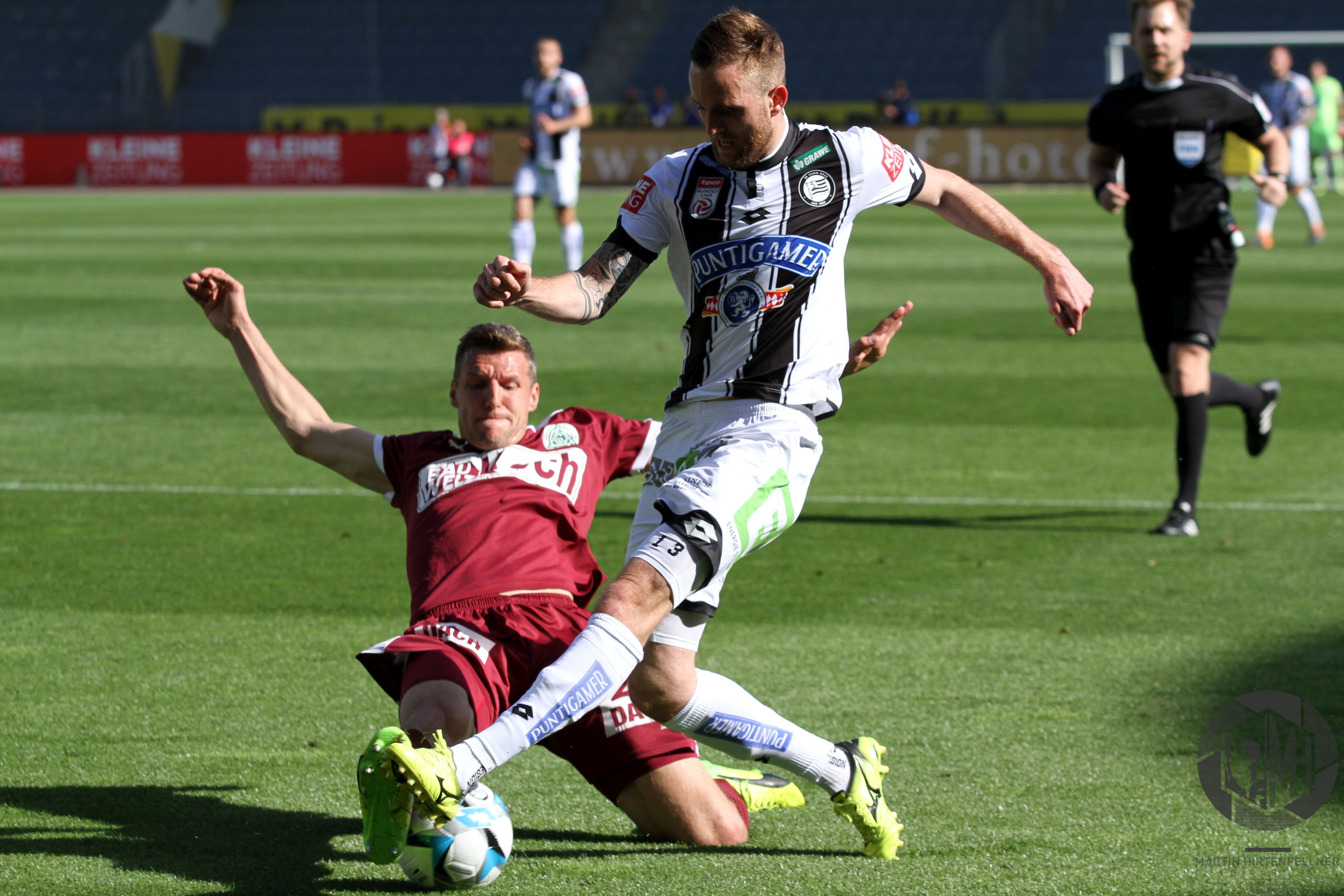 Pünktlich um 16:00 pfiff Schiedsrichter Julian Weinberger die Partie an und zunächst taten sich beide Teams schwer, ins Spiel zu finden. Sturm hatte oft den Ball, vermochte aber nichts Zwingendes zu kreieren. In der achten Spielminute herrschte dann erstmals Gefahr im Strafraum der Burgenländer. Alar flankte präzise in die Mitte, Kapitän Nedeljko Malic konnte gerade noch vor dem einschussbereiten Jakob Jantscher klären. Danach war der Tabellenzweite viel besser im Spiel und fand in der 13. Minute erneut die Möglichkeit zur Führung vor. Nach klasse Aktion von Eze zog Alar den Tick zu früh ab, Torhüter Markus Kuster konnte zur Ecke klären. Auf der Gegenseite klärte Spendlhofer vor Andreas Gruber. In der 16. Minute sorgte Dario Maresic dann beinahe für das Tor des Jahres, das man wahrscheinlich auch 20 Jahre später noch immer in jedem Highlightvideo über die Schwarz-Weißen finden würde. Nach Ecke von Peter Zulj setzte er in Cristiano Ronaldo-Manier zum Seitfallzieher an, der Versuch strich jedoch leider am rechten Pfosten vorbei. Auch danach blieb der Gastgeber am Drücker, einzig ein Torerfolg fehlte noch.