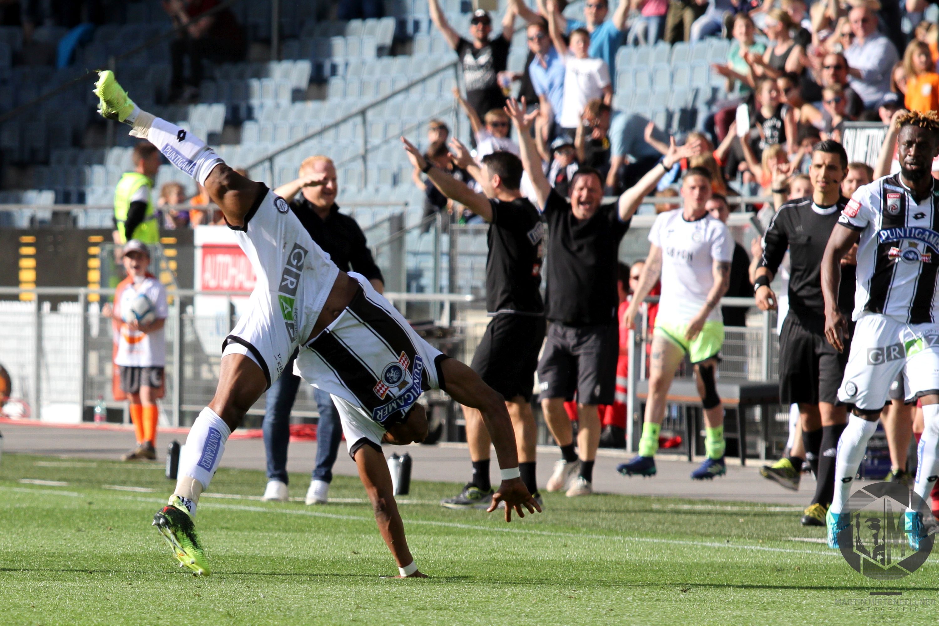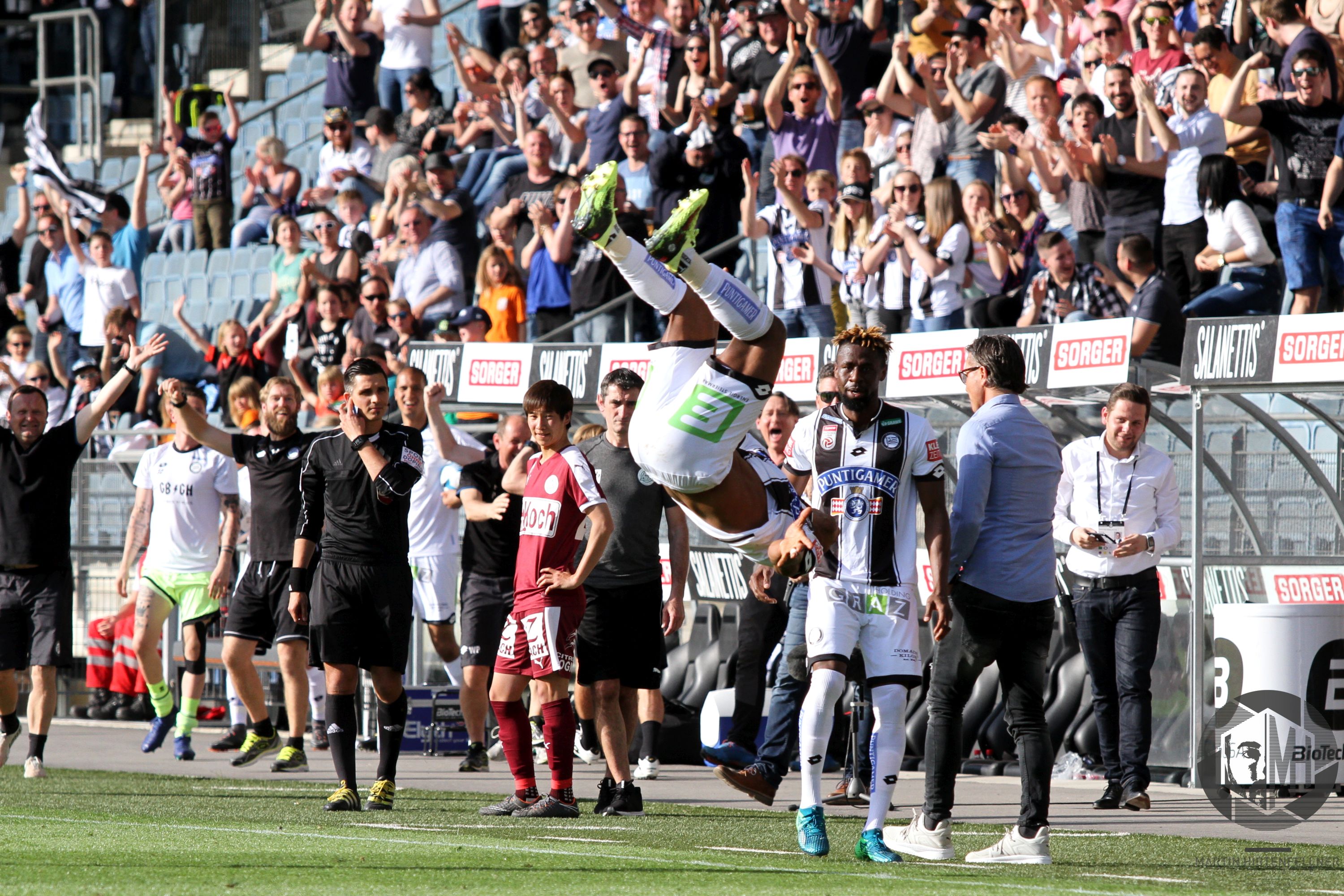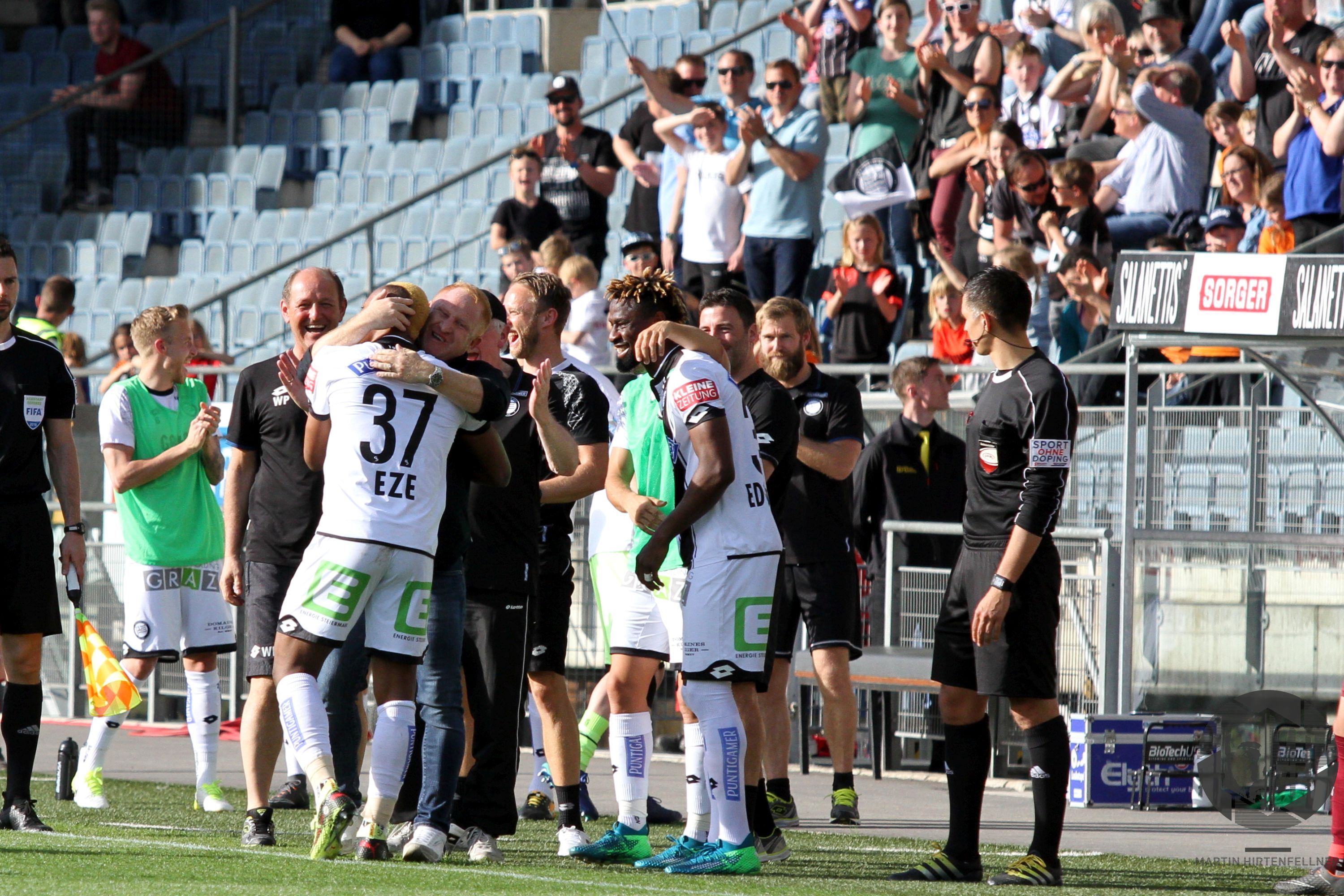 Gerald Baumgartner veränderte seine Mannschaft auf einer Position, für Manuel Seidl kam Julius Ertlthaler in die Partie. Sturm kam mit derselben Elf aus der Kabine, was aufgrund der sehr guten ersten Spielhälfte auch nicht verwunderte. Die Burgenländer mussten aufgrund des Rückstandes nun deutlich mehr riskieren und taten dies bereits zu Beginn der zweiten 45 Minuten mit viel Nachdruck. Andreas Gruber flankte präzise auf den bis dato unauffälligen Markus Pink, der aus kurzer Distanz den Ball verpasste und somit die Riesenchance auf den Anschlusstreffer ausließ. Die Gäste agierten in dieser Phase des Spiels deutlich aggressiver und hätten in der 54. Minute einen Elfer zugesprochen bekommen müssen, als Maresic Smail Prevljak im Strafraum legte. Die Blackys standen unter hohem Druck, konnten sich in der 56. Minute allerdings befreien. Und wie! Nach Abschlag von Siebenhandl kontrollierte Eze die Kugel gekonnt und überlistete Kuster mit einem sensationellen Schuss aus gut 35 Metern. Graz hatte nun doch noch sein Traumtor an diesem Samstagnachmittag! Zehn Minuten später sorgte Bright Edomwonyi, der für Doppeltorschütze Deni Alar in die Partie gekommen war, fast für das 4:0, nach traumhafter Kombination scheiterte er aber am Mattersburger Schlussmann.