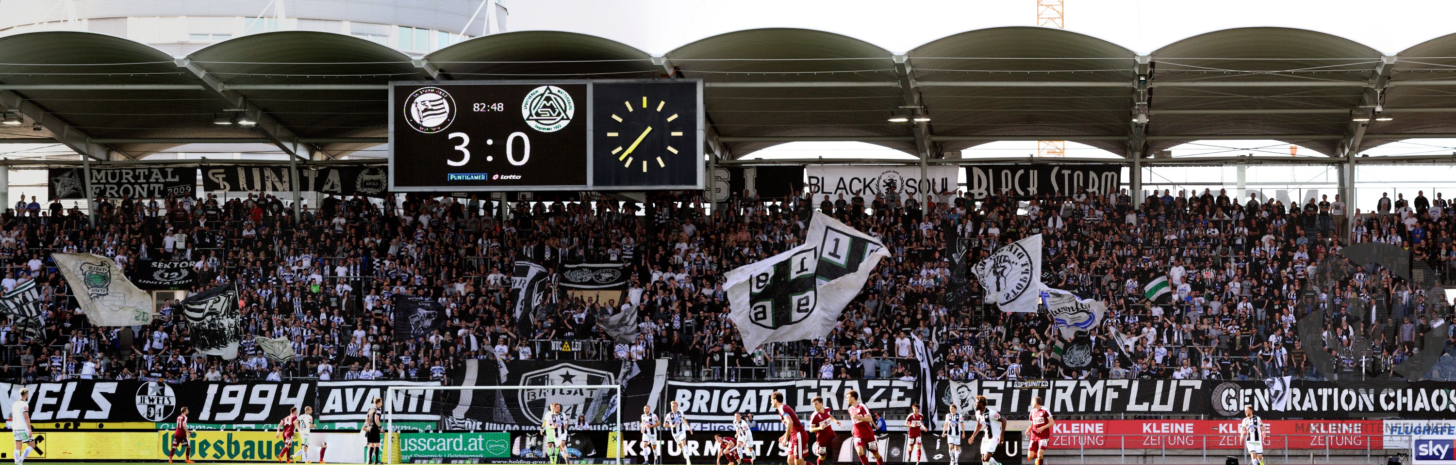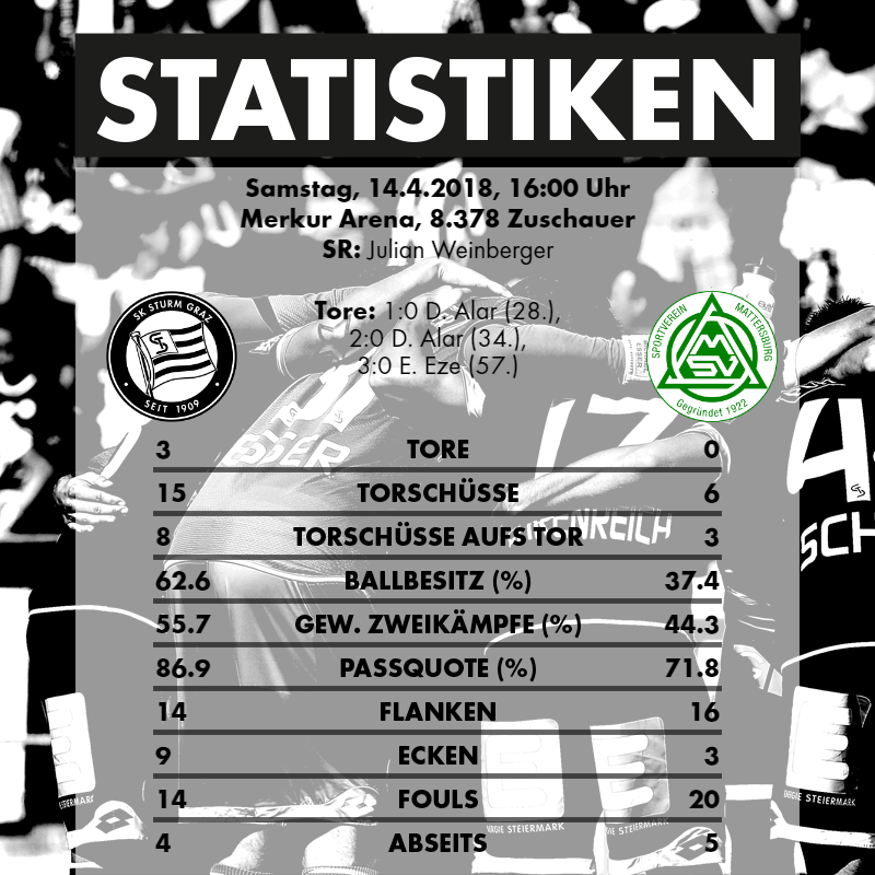 Nach der kurzen Drangperiode der Gäste zu Beginn der zweiten Halbzeit hatte Sturm die Kontrolle über das Spiel wiedererlangt und spulte in eindrucksvoller Manier das gewohnte Kurzpassspiel gepaart mit gefährlichen Zuspielen in die Spitze ab. In der 71. Spielminute bekam Eze seinen verdienten Abschiedsapplaus, James Jeggo sollte das 3:0 zusätzlich absichern. Die Begegnung war zu diesem Zeitpunkt gefühlt bereits entschieden, dennoch blieben die Grazer am Gaspedal. In der 77. Minute kam Philipp Huspek für Thorsten Röcher aufs Spielfeld und sorgte zwei Minuten nach seiner Einwechslung beinahe für den vierten Treffer. Die Mattersburger konnten nach wunderschöner Kombination aber in letzter Sekunde klären. Der Tabellenzweite ließ danach bis auf eine Gelegenheit von Alejandro Velasco Farinas überhaupt nichts mehr anbrennen und spielte das Spiel souverän nachhause. Dass ein regulärer Treffer von Edomwonyi in der Nachspielzeit nicht anerkannt wurde, schmerzte dabei nur bedingt. Mit dem Sieg verkürzten die Schwarz-Weißen den Rückstand auf RB Salzburg erneut auf fünf Punkte, am Mittwoch geht es im ÖFB-Cup-Halbfinale zuhause gegen den SK Rapid Wien. Und wie die Fans am Ende der Partie skandierten, gibt es nur ein Motto: Wir wollen ins Finale!
