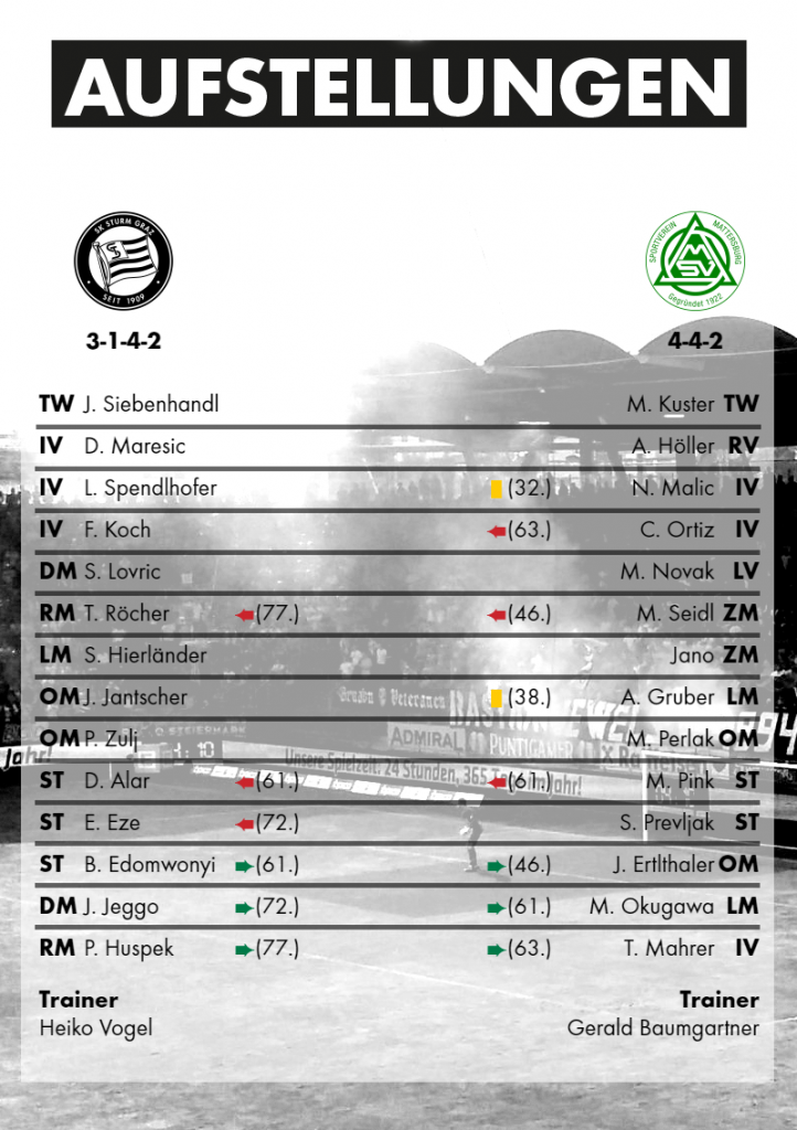Doch zurück in die Gegenwart. Die aktuelle Mannschaft der Grazer schickt sich an, in die Fußstapfen der historischen Elf zu treten und ähnlich Großartiges zu erreichen. Derzeit rangieren die Blackys auf Rang zwei und der Abstand von acht Punkten nach vorne und hinten sorgt momentan für relativ entspannte Stimmung in der steirischen Landeshauptstadt. Dass die Partie gegen den SV Mattersburg bei herrlichem Wetter dennoch zu keinem laschen Sommerkick verkommen sollte, dürfte Heiko Vogel seinen Mannen im Laufe der Woche nach der Niederlage gegen die Wiener Austria unmissverständlich klargemacht haben. Denn mit Blick auf die Aufstellung war klar, dass der Cheftrainer in dem Spiel gegen den Tabellensiebenten auf volle Offensivpower setzen würde. Das Sturmduo bildeten dieses Mal Emeka Friday Eze und Deni Alar, auf den Flügeln kamen Thorsten Röcher und Stefan Hierländer zum Einsatz. Im defensiven Mittelfeld bekam Sandi Lovric wieder einmal eine Chance, seine Klasse unter Beweis zu stellen, während in der Abwehr Dario Maresic, Lukas Spendlhofer und Fabian Koch für Stabilität sorgen sollten.