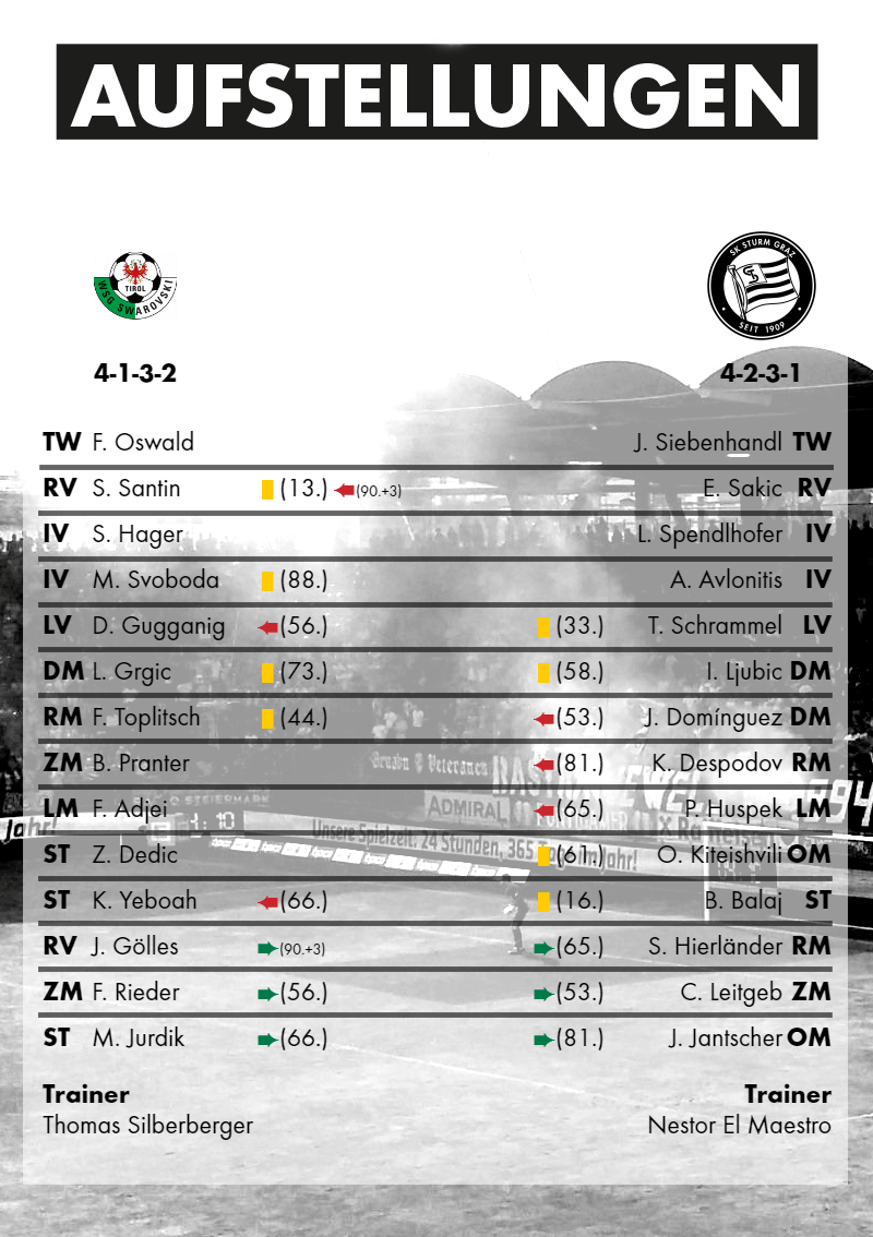 „Für unsre Schwoazen ziag ma quer durchs Lond…“, lautet auch an diesem Wochenende wieder das Motto der schwarzen-weißen Anhängerschaft. Nach dem vergangenen Auswärtsspiel gegen Rapid ging es heute zum Aufsteiger nach Tirol. Das erste Aufeinandertreffen gegen die WSG konnte Sturm souverän mit 2:0 für sich entscheiden und auch in der Tabelle liegen die Blackys klar vor den Tirolern. Wenig überraschend also, dass man Sturm im Vorfeld der Begegnung die Favoritenrolle zusprach. Trainer Nestor El Maestro warnte seine Mannen dennoch vor dem heutigen Gegner: „Die Mannschaft von Wattens präsentiert sich überwiegend zuhause sehr stark. Sie haben da einige gute Leistungen abgeliefert und hier und da unerwartete Siege geholt. Wir müssen auf jeden Fall unser bestes Gesicht zeigen und unsere Topleistung abrufen, um am Ende erfolgreich vom Platz zu gehen.“ Dazu vertraute El Maestro jedoch nicht der gleichen Elf, die gegen Rapid beginnen durfte. Statt Isaac Donkor (verletzt) rückte Ivan Ljubic in die Startelf und auch Stefan Hierländer musste sich ob einer Erkältung zunächst mit der Reservistenrolle begnügen. Anstelle des Kapitäns bekam Thomas Schrammel die Chance, sein Können von Beginn an unter Beweis zu stellen. Mit diesen personellen Änderungen geht eine Systemumstellung auf ein 4-2-3-1 einher.