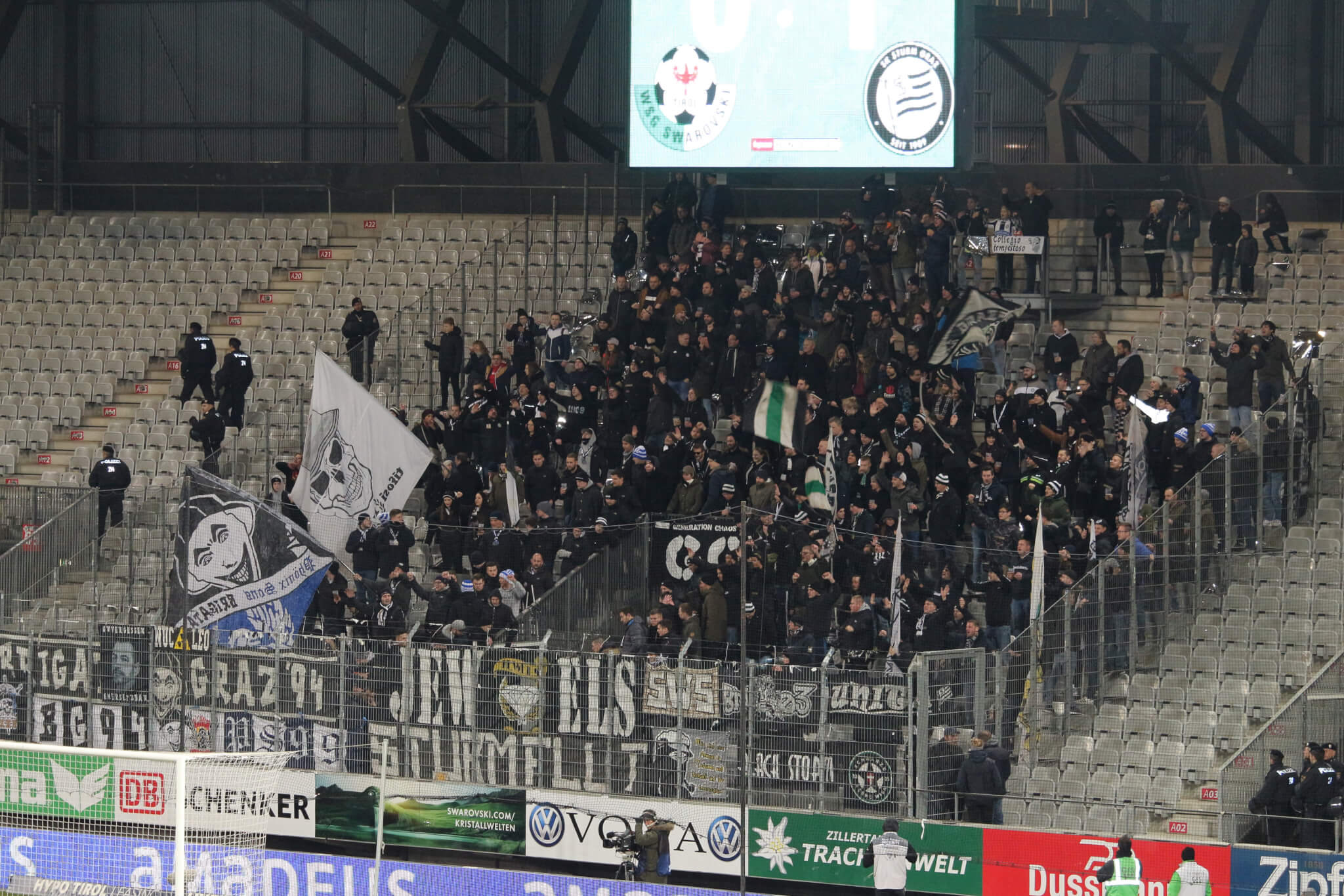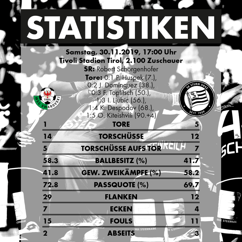 Pünktlich um 17:00 Uhr pfiff Schiedsrichter Robert Schörgenhofer die Partie zwischen dem Neunten und Fünften der Tabelle an. Der Gästeblock versuchte von Beginn an, bei Temperaturen um den Nullpunkt dem Spiel ordentlich einzuheizen. Auch die Mannschaft versuchte, von Anfang an einen heißen Auftritt hinzulegen und setzte die Abwehr der Tiroler mit frühem Anlaufen unter Druck. Die Kicker der WSG Tirol wussten jedoch dieses „Pressing“ geschickt zu umgehen und sorgten mit vereinzelten Vorstößen immer wieder für Gefahr vor dem Grazer Tor. Doch ausgerechnet einer dieser Offensiv-Vorstöße sollte den Tirolern zum Verhängnis werden. Nach einem Eckball der WSG schalteten die Grazer blitzschnell um. Ivan Ljubic spielte einen geschickten Laufpass auf Otar Kiteishvili. Dessen Flanke fand den in der Mitte völlig freistehenden Philipp Huspek. Dieser vollendete wie schon beim Auswärtsspiel gegen Rapid eiskalt. Die Tiroler zeigten sich aber völlig unbeeindruckt vom Treffer und versuchten nach wie vor, weiter nach vorne zu spielen. Wenig verwunderlich kamen sie so auch nach einem gefährlichen Abschluss aus der zweiten Reihe zu einer guten Chance. Jörg Siebenhandl konnte aber im Nachgreifen gut parieren. Im weiteren Spielverlauf versuchte Sturm immer wieder, schnell über die Flügel umzuschalten. Philipp Huspek und Kiril Despodov waren oft nur durch Fouls der Tiroler Abwehr zu stoppen. Sturm agierte zu diesem Zeitpunkt jedoch sehr passiv und überließ den Tirolern die Spielkontrolle. Gerade in einer Phase, in der die WSG das Geschehen im Griff hatte, konnte Despodov die nächste Halbchance für Sturm verbuchen. Es schien so, als hätte El Maestro im Vorfeld der Partie die beiden Abwehrseiten der Wattener als Schwachpunkte ausgemacht. Immer wieder ging es über die Flügel mit anschließender Flanke auf Bekim Balaj. Dieser tat sich aber oft schwer, den Ball zu erreichen. Die Tiroler blieben immer bissig und zeigten vor allem bei den zweiten Bällen ihre Zweikampfstärke. Die Gastgeber hatten weiterhin mehr Ballbesitz und Sturm lauerte auf den Konter. Wenn die Blackys am Ball waren, fehlten oft die Ideen oder es mangelte an der Genauigkeit der Pässe. So gab es immer wieder viel Platz für die WSG, den diese aber nur gelegentlich nutzen konnten – wie bei der Chance von Sebastian Santin, der den Ball nach einer Flanke völlig freistehend nicht im Tor unterbrachte. Sturm lauert zu diesem Zeitpunkt nur mehr auf Konterangriffe und tat weniger für das Spiel. In der 38. Minute gab es jedoch einen Freistoß für Sturm. Despodov brachte den Ball aus halbrechter Position hinein, Balaj verlängert diesen und Juan Dominguez köpfelte völlig unbedrängt zum 2:0 ein. Dieses Tor kam zwar völlig aus dem Nichts, beflügelte die Grazer gegen Ende der ersten Hälfte aber noch einmal. Doch genau in dieser Phase hatte die Heimmansschaft nach einer Freistoßflanke die Chance, den Anschlusstreffer zu erzielen: Jörg Siebenhandl war jedoch wachsam und konnte den Anschlusstreffer verhindern. Wieder einmal probierten die Grazer ihr Glück über den linken Flügel. Otar Kiteishvili fand nach einem starken Flankenlauf aber keinen Abnehmer für seine Hineingabe in die Mitte. Trotz einer phasenweise nicht überragenden Leistung ging Sturm mit einer komfortablen 2:0-Führung in die Halbzeitpause.