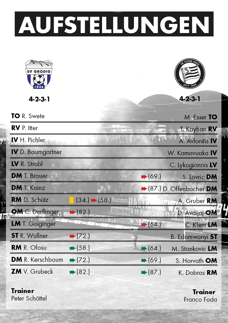 Für Tore im Spiel der Schwarzen soll einmal mehr Bright Edomwonyi, der im letzten Testspiel gegen Lok Zagreb aufzeigen konnte, sorgen. Der zweite Torschütze vom 2:2 gegen die Kroaten, Martin Ehrenreich, befindet sich nicht einmal im Kader. Hoffentlich rächt sich das nicht und die fehlende Torgefährlichkeit „Öhrli’s“ macht sich am Ende des Spiels nicht bemerkbar. Lukas Spendlhofer, gelbgesperrt, wird in der Innenverteidigung durch Wilson Kamavuaka ersetzt, dafür darf Sandi Lovric nach längerer Abstinenz wieder im defensiven Mittelfeld neben Daniel Offenbacher auflaufen. Die Flügel besetzen diesmal Andreas Gruber und Christian Klem, deren mangelhafter Torriecher soll vermutlich mit dem des Donis Avdijaj kompensiert werden.