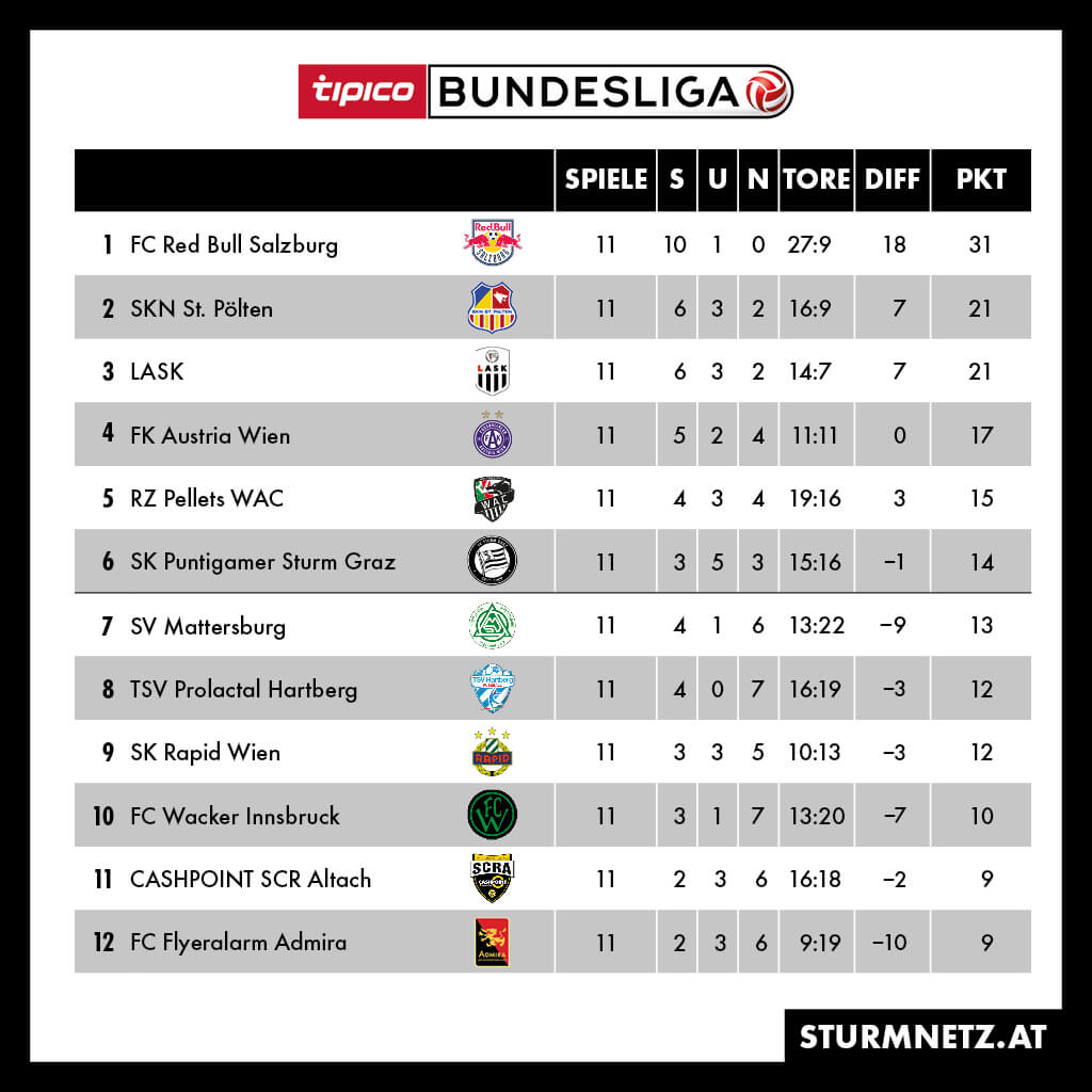 Das neue Format der österreichischen Fußballbundesliga der Herren ermöglicht es bereits im Oktober ein Fazit über die Hinrunde zu ziehen. Elf Matches haben die Schwoazen vom SK Sturm bestritten, gegen jeden Gegner also einmal gespielt. Drei Siege stehen drei Niederlagen gegenüber. Zudem ist man Unentschieden-Kaiser der Liga, mit deren fünf an der Zahl. 15 erzielten Toren stehen 16 Gegentore gegenüber. Summiert man all diese Zahlen ergibt das Tabellenplatz sechs und die schmerzende Erkenntnis, dass der SK Sturm Graz derzeit im österreichischen Fußball einfach nur Durchschnitt ist.